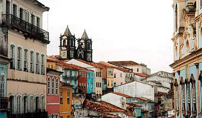 Sight of Slope of Pelourinho, with the colorful houses and Church of Carmo